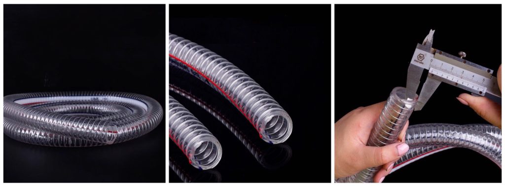 2.观察钢丝管管壁是否存在气泡或其他肉眼可见物是否为无色透明。高质量的PVC钢丝管的管壁晶莹剔透无任何杂质。而次品PVC钢丝管颜色泛黄可能在生产过程中由于处理不当有所分解、老化或长期不当存放所致。